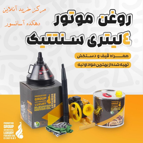 روغن سنتتیک در حجم بسته بندی 4 لیتری مخصوص موتورگیربکس آسانسور همراه با متعلقات شامل قیف و دستکش تهیه شده از بهترین مواد اولیه